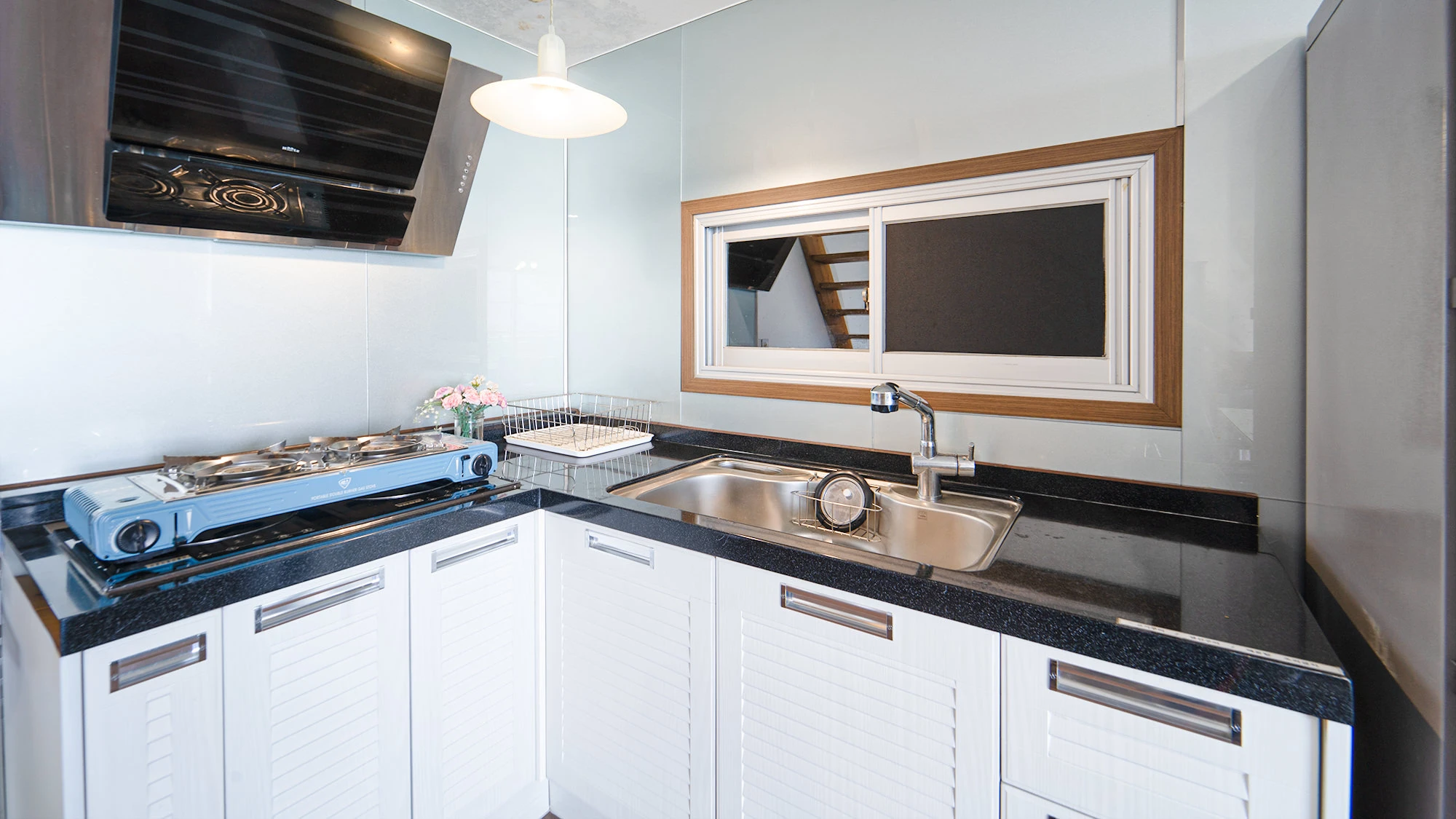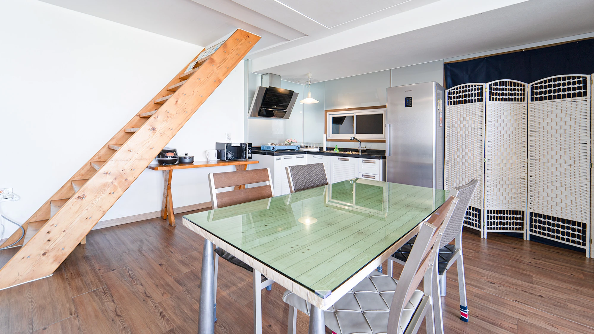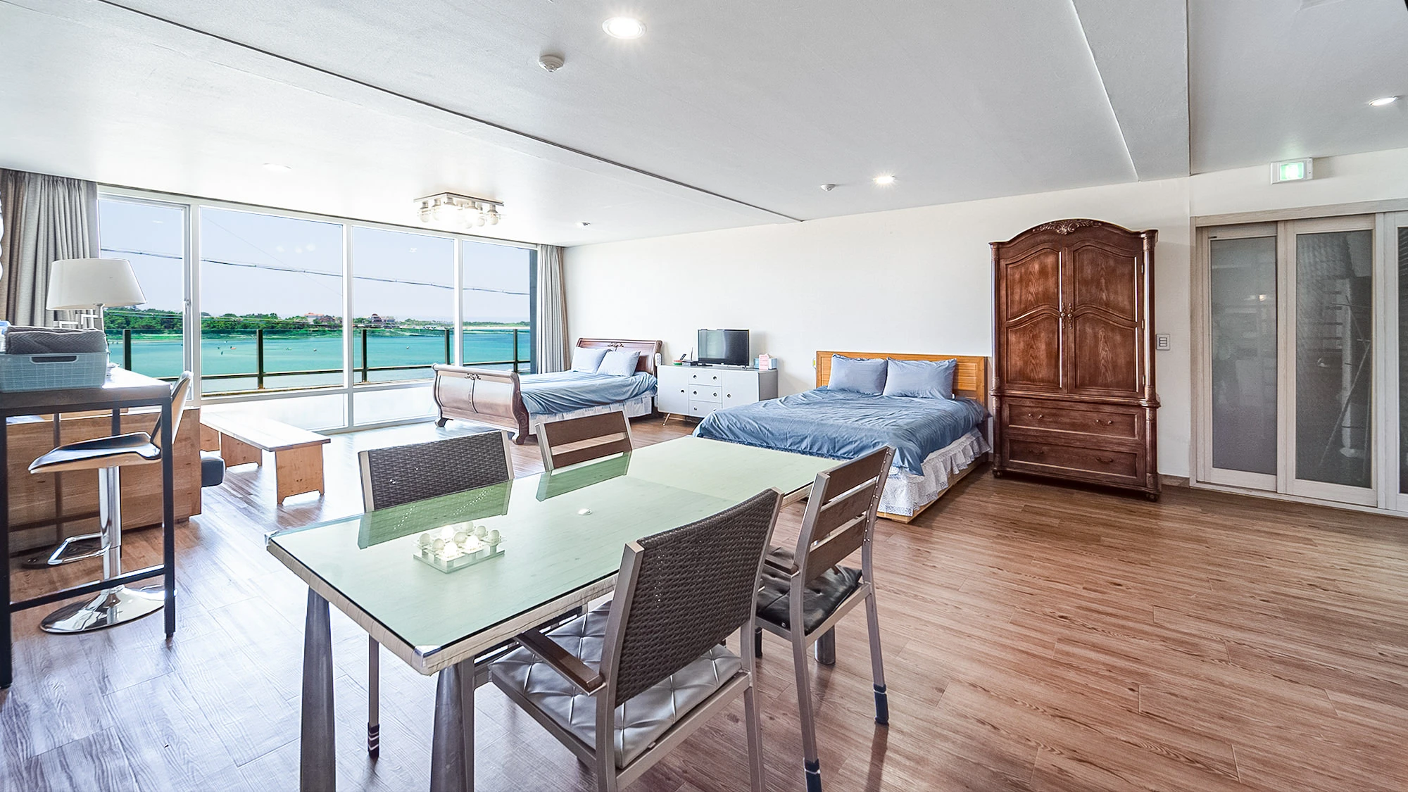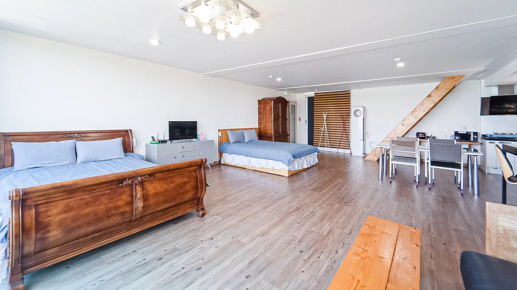 - 집기품목 : TV, 냉장고, 전자레인지, 타월, 드라이기, 샴푸, 린스, 바디워시, 치약, 비누, 취사시설/도구, 인덕션, 와이파이, 금연, 무선인터넷, 세면도구, 화장대, 가스레인지, 소화기, 에어컨, 트윈베드, 화재 감지기, 가족실, 커피포트, 욕실용품, 바다전망